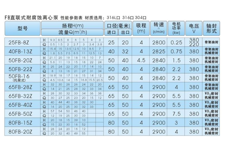 FB型耐腐蝕泵適用于化工、石油、冶金、輕工、印染、制藥、環保、海水淡化、海上采油、造紙、食品、發電等工業部門輸送不含固體顆粒的有機或無機化工介質,石油產品及腐蝕性液體。也可供企業及城市供水、排水之用。FB、AFB型不銹鋼耐腐蝕離心泵廣泛應用于化工、石油、冶金、輕工、合成纖維、環保、食品、醫藥等部門。適用于食品、釀造、制藥、飲料、煉油、調料及純水等行業輸送清水及物理化學性質類似于水的含有腐蝕性的其他液體。使用介質溫度≤150℃或使用介質溫度在150-250℃時,可采用水冷卻式泵。